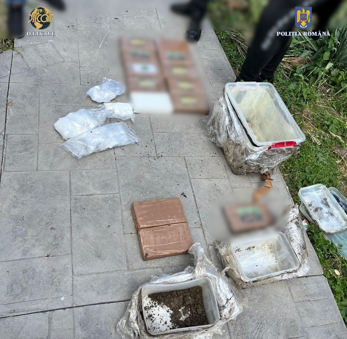 Drogurile, porționate în calupuri protejate în straturi de folie și cutii au fost găsite îngropate în mai multe locuri din curtea imobilului în care locuiesc doi dintre inculpați.