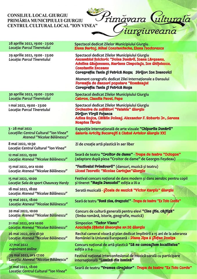 Seară de teatru și două festivaluri de dansuri și muzică, oferite în această săptămână, în cadrul Primăverii Culturale Giurgiuvene