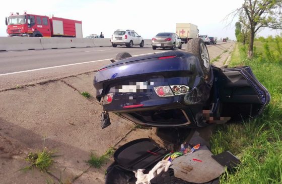 ACCIDENT RUTIER. Autoturism răsturnat pe DN 5 Giurgiu-București, în zona localității Uzunu (FOTO)