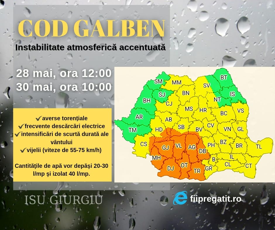ISU Giurgiu. Cod galben de instabilitate atmosferică temporar accentuată, până luni dimineață