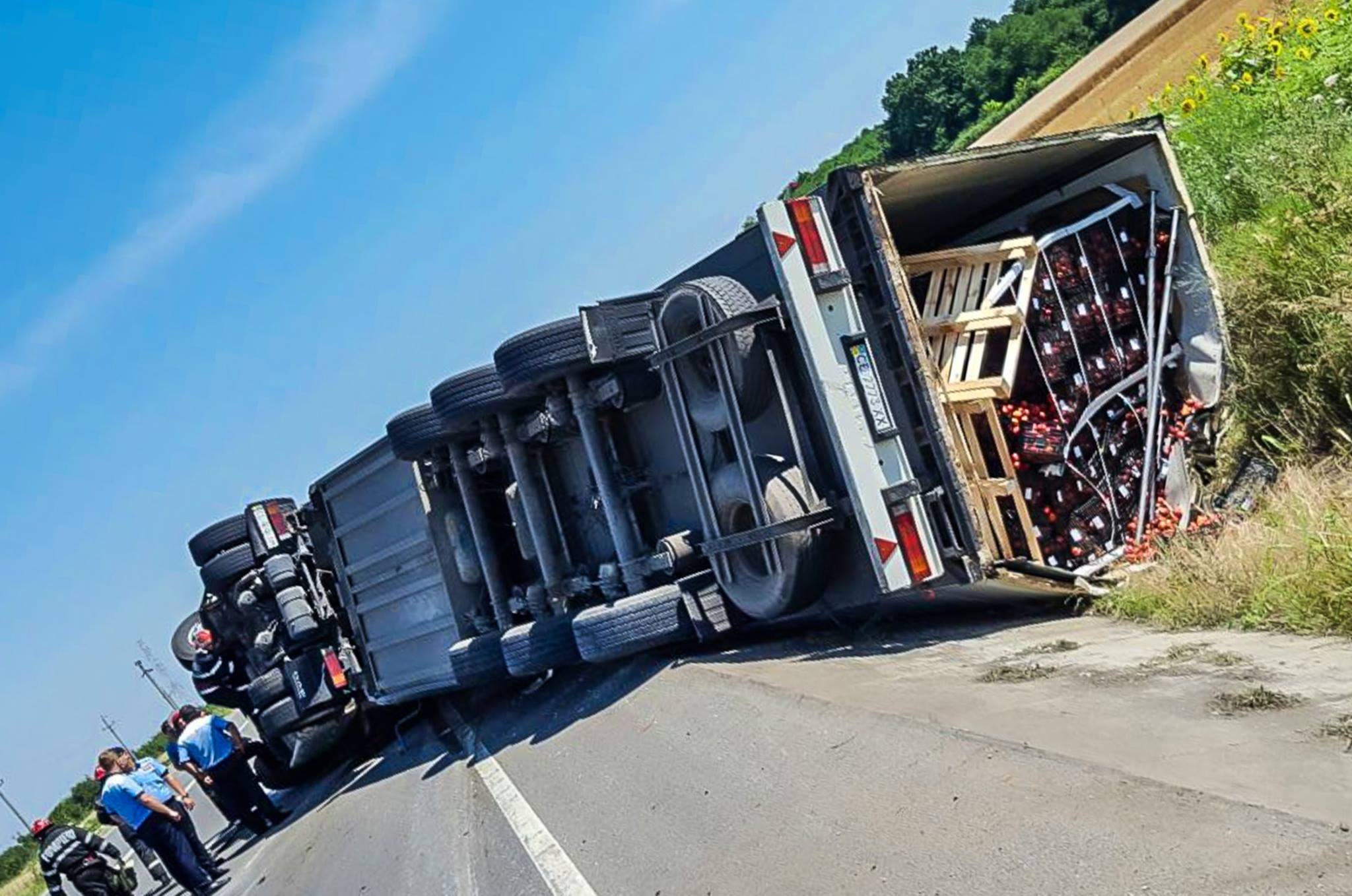 Un TIR încărcat cu nectarine s-a răsturnat, în urmă cu puţin timp, pe DN5, în Zona Alidora.