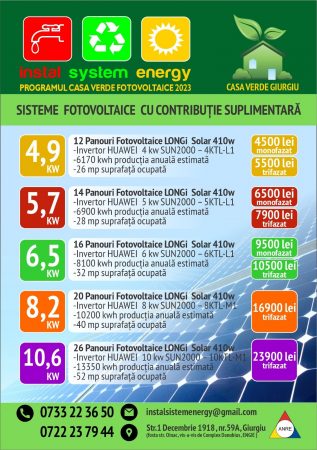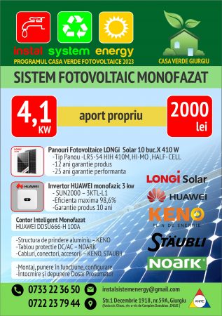 Firma Instal Sistem Energy Giurgiu este validată AFM şi autorizată ANRE, cu experienţă în programele Casa Verde şi activitate de peste 13 ani în domeniul instalaţiilor.