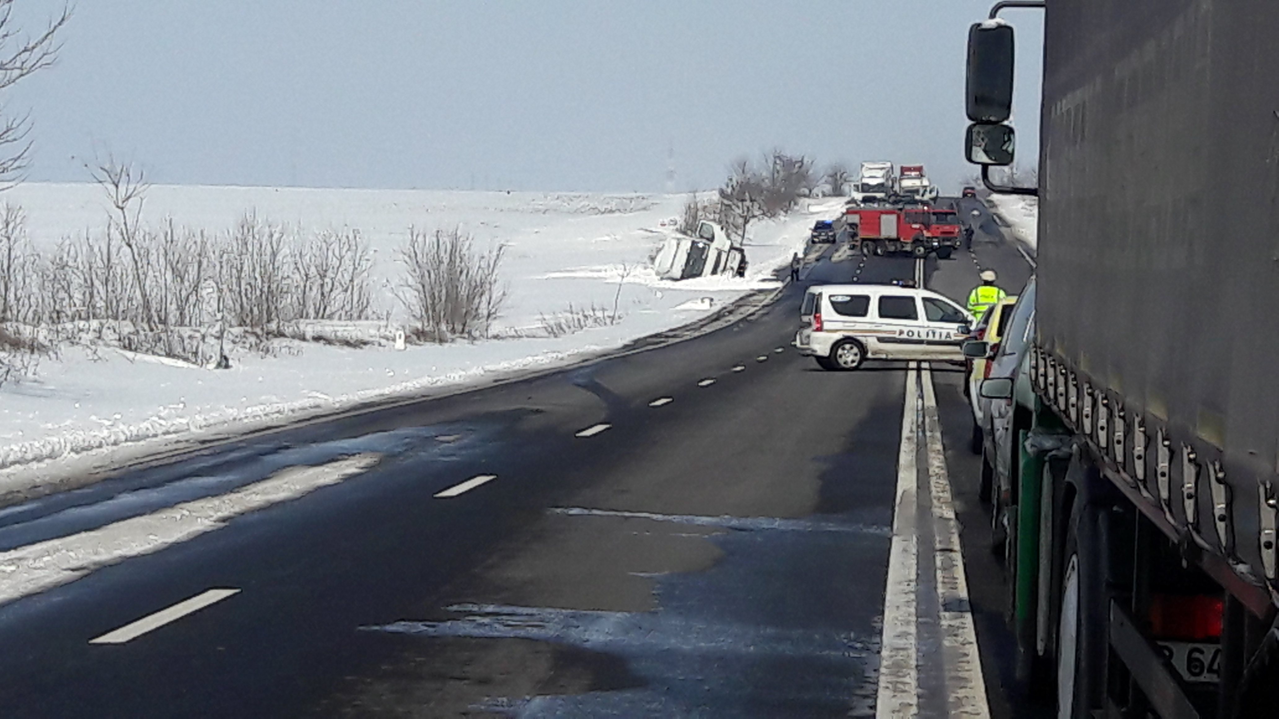 IMG-20180301-WA0008O cisternă încărcată cu butan s-a răsturnat, astăzi, în jurul orei 13, pe DN 5, la ieșirea din Uzunu, pe sensul către Giurgiu, în zona adăpostului de câini Dog Town. Două autospeciale de lucru cu apă și spumă de la ISU Giurgiu au intervenit la fața locului.