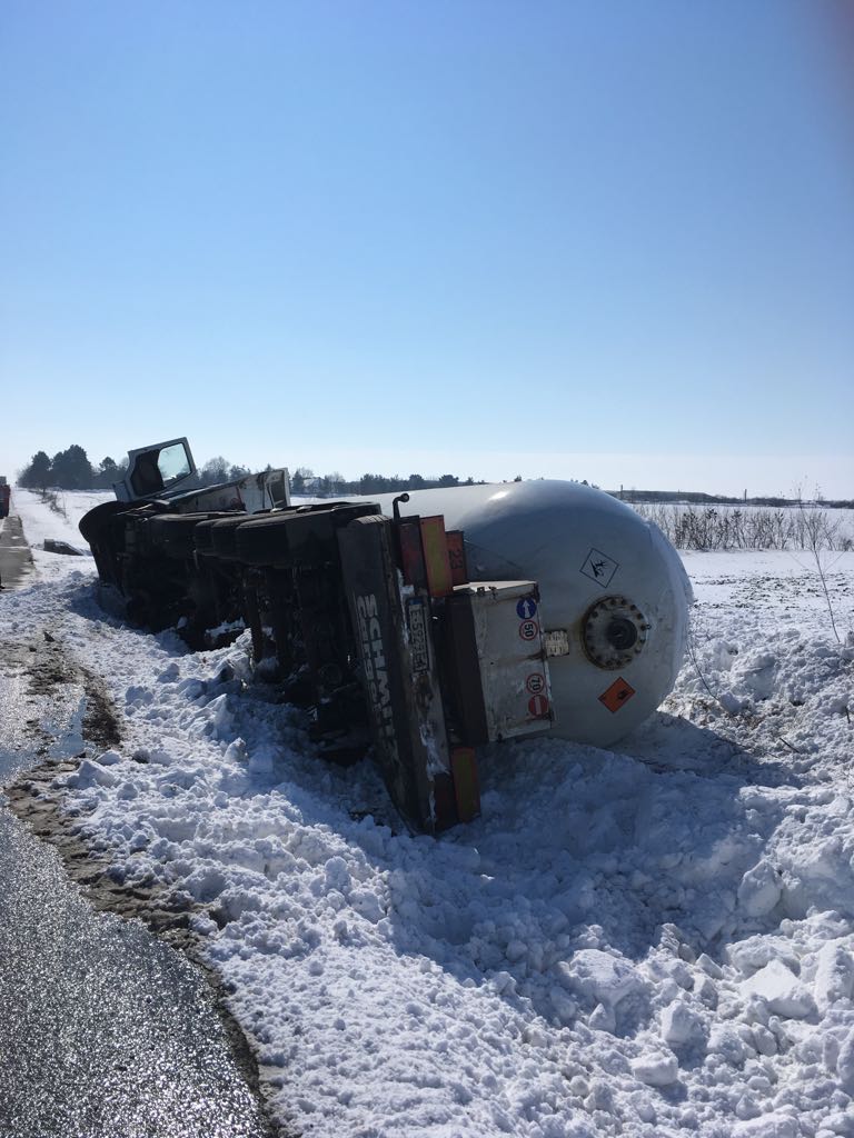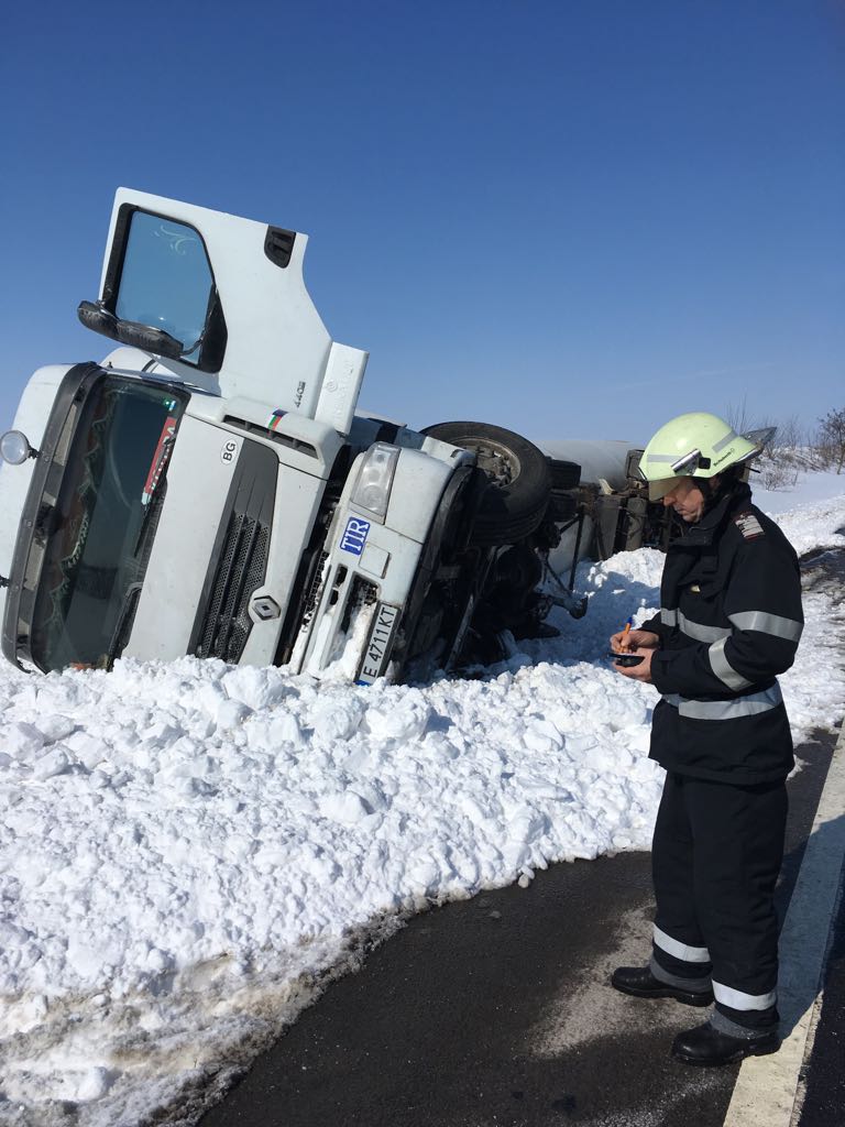 ACCIDENT: Cisternă încărcată cu butan, răsturnată pe DN 5 (FOTO)