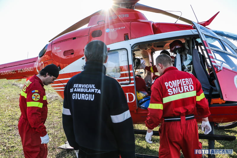 Acesta a fost rănit grav, fiind inconştient. Victima a fost preluată de un elicopter SMURD şi transportată de urgenţă la un spital din Bucureşti.