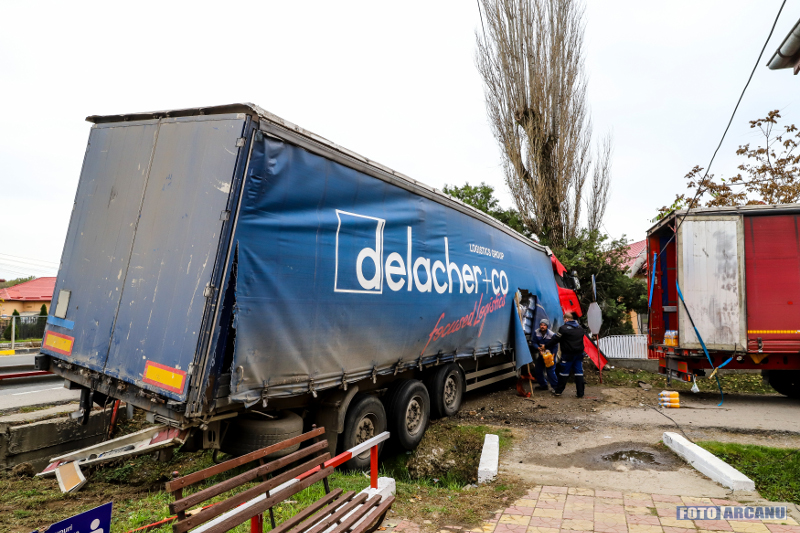 Şoferul unui autotren nu a adaptat viteza pentru a intra în sensul giratoriu, a pierdut controlul volanului, a părăsit partea carosabilă şi a intrat cu autotrenul în gardul Muzeului din Călugăreni, fiind oprit de un stâlp de electricitate.