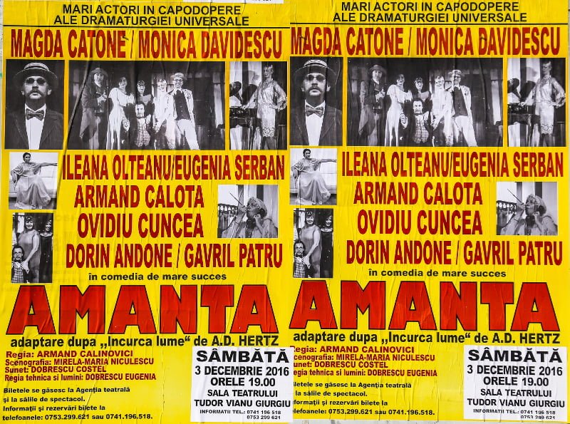 Comedia „Amanta” în regia lui Armand Calinovici, o adaptare după celebra lucrare „Încurcă lume” de A.D. Hertz, va fi pusa in scena de la Giurgiu, sâmbătă, 3 decembrie 2016, de cu începere de la orele 19:00, de artisti cu notorietate, iubiti de public pentru rolurile de exceptie interpretate in numeroase filme si piese de teatru din aria comediei : Ilinca Goia (Olga), Magda Catone/Monica Davidescu (Didina Strâmbuleanu), Marius Rizea (Bungrăzescu Traian) Dorin Andone/Gavril Pătru (Matei Pintenaru) şi Armand Calotă (Emil Strâmbuleanu), o distribuţie excepţională ce va aduce zâmbetele pe buzele tuturor spectatorilor.