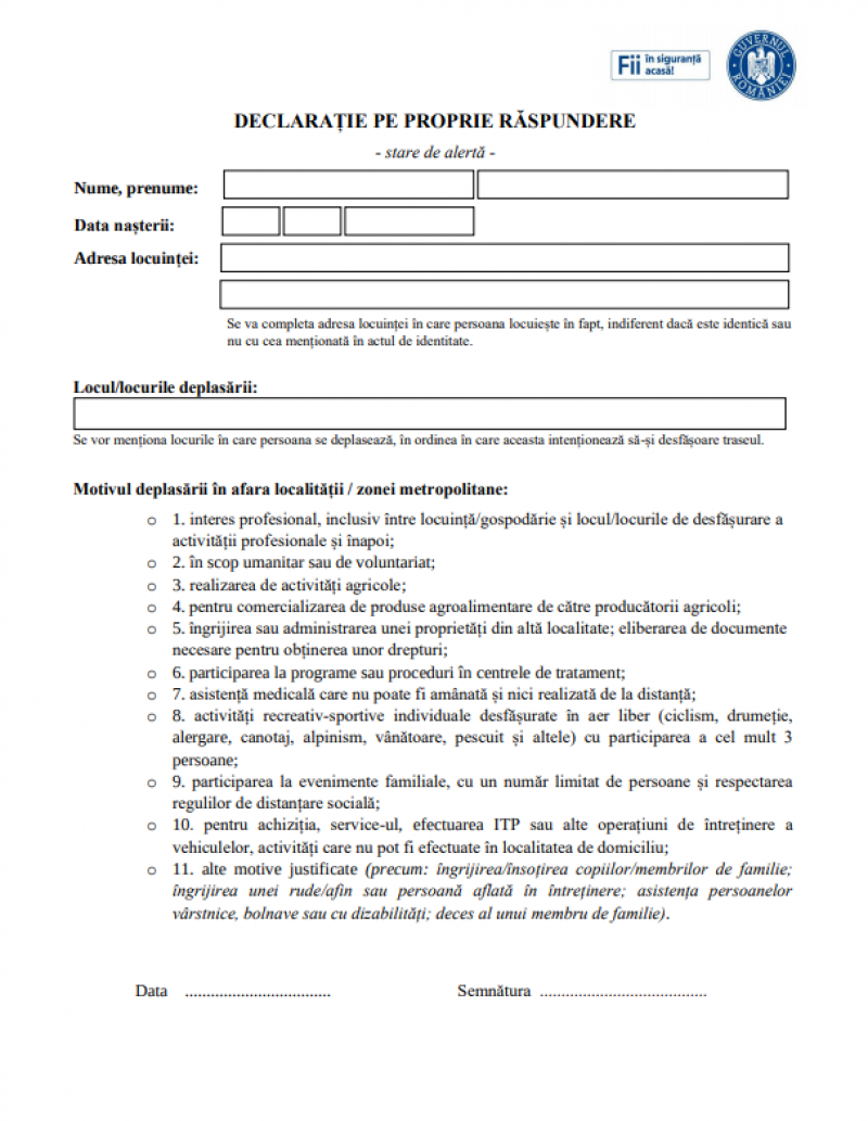 Descărcaţi DECLARAŢIA AICI https://www.mai.gov.ro/wp-content/uploads/2019/01/Declaratie-proprie-raspundere-stare-de-alerta.pdf