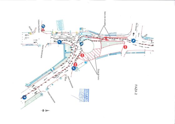 - Faza 2 – traficul rutier în sensul giratoriu se va desfășura astfel: pe sensul de intrare în oraș se va circula pe ambele sensuri până la ieșirea din sensul giratoriu.