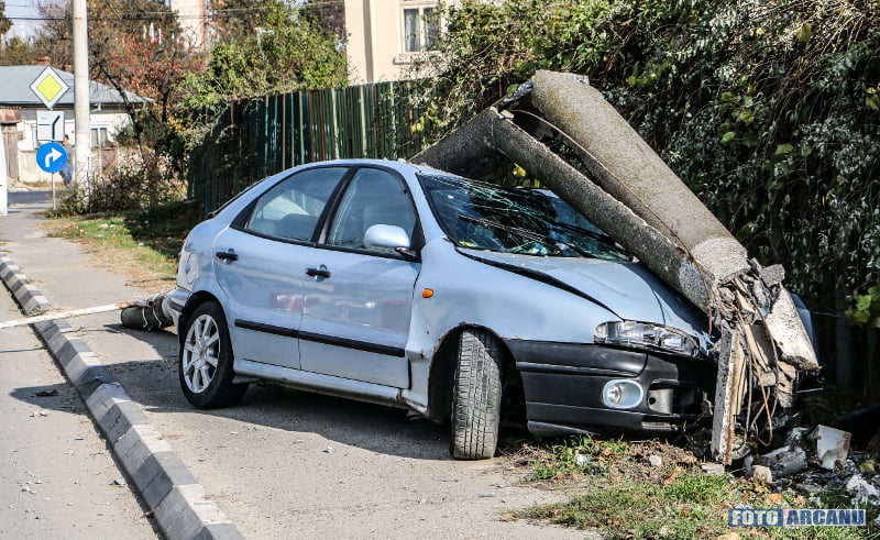 Maşină făcută praf după ce a intrat într-un stâlp, la Giurgiu