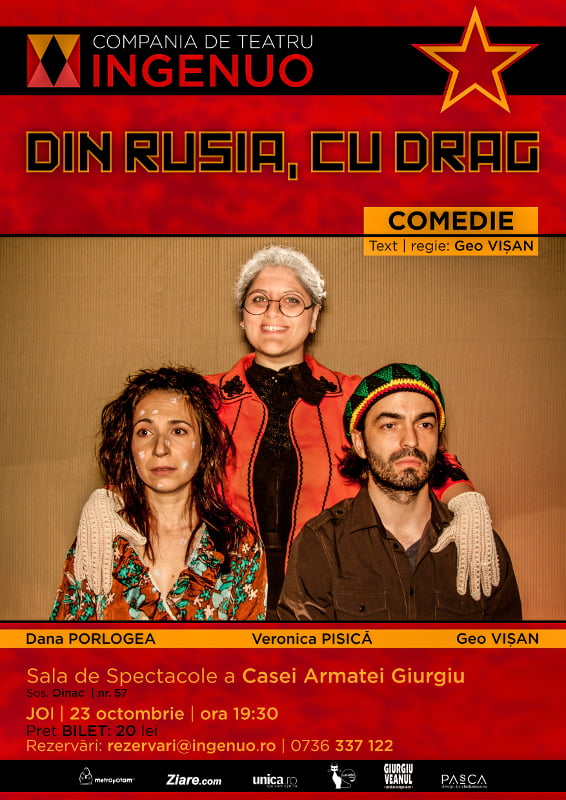 _afis_giurgiu_23oct_A1-2Piesa “Din Rusia, cu drag” se joacă Joi, 23 Octombrie, ora 19.30 la Sala de Spectacole a Casei Armatei Giurgiu (Muzeul Poliţiei de Frontieră). Textul şi regia spectacolului sunt semnate de Geo Vişan, actor ce face parte de altfel şi din distribuţie, alături de Dana Porlogea şi Veronica Pisică.