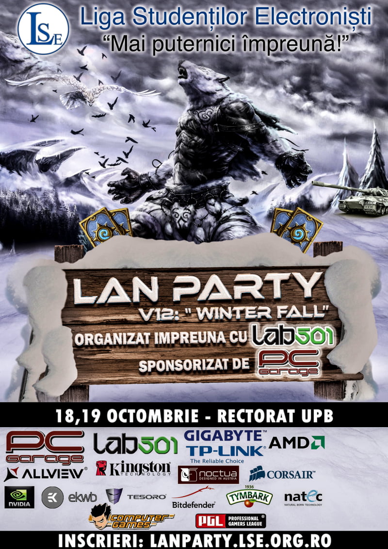 Afis_LANPartyv12WinterFALL-2Liga Studenților Electroniști(LSE) vă invită la LAN Party v12, un eveniment organizat împreună cu Lab501 (www.lab501.ro) și sponsorizat de PC Garage (www.pcgarage.ro). Proiectul devenit deja tradiție în rândul pasionaților de jocuri video și IT, LAN Party v12 reunește sute de jucători pasionați, având premii pe măsură, asigurate de sponsori cunoscuți. Continue reading