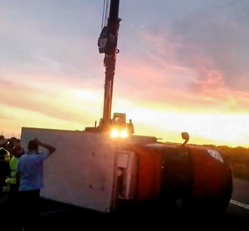 Tir răsturnat pe DN5, repus pe roţi de macaraua pompierilor militari
