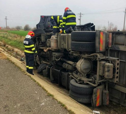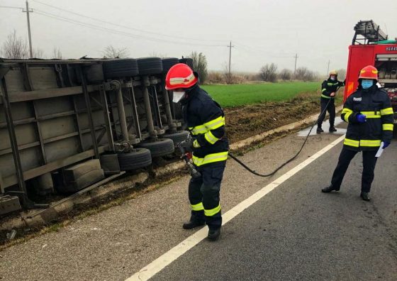 Pompierii din cadrul Detașamentului Giurgiu au intervenit pe DN 5, în zona Alidora, acolo unde un autotren, încărcat cu plăci OSB, a părăsit partea carosabilă și s-a răsturnat în șanțul de la marginea drumului.