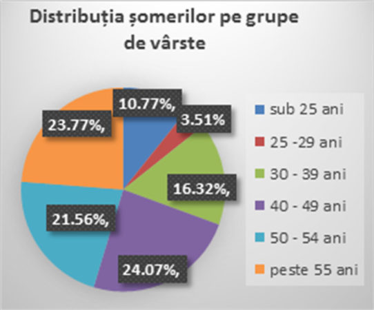 Cei mai mulţi şomeri aveau între 40 – 49 de ani (391), urmaţi de cei din grupa de vârstă peste 55 de ani (386), la polul opus aflându-se persoanele între 25 – 29 de ani (57).