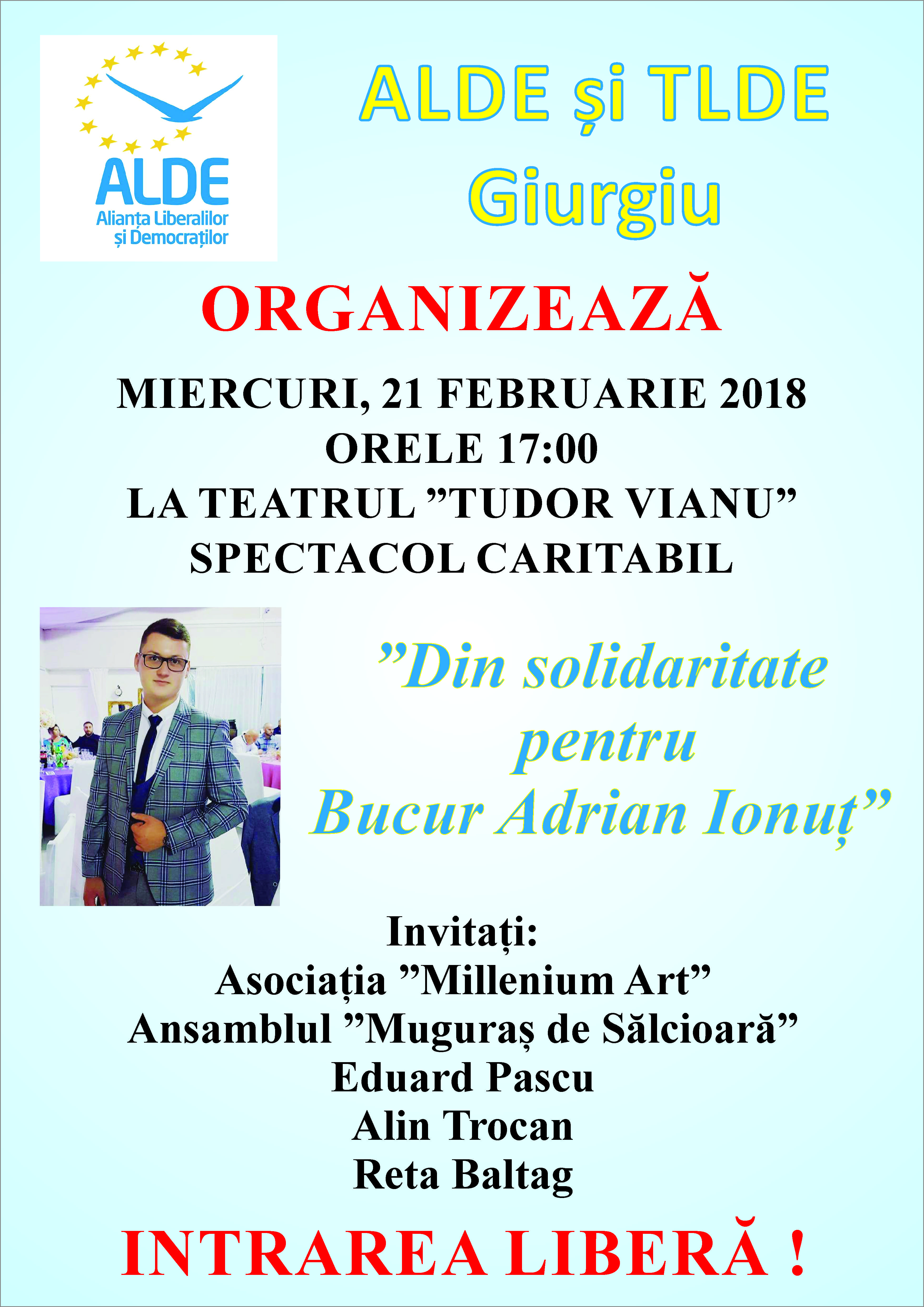 SPECTACOL UMANITAR, organizat de ALDE şi TLDE Giurgiu: “Din solidaritate pentru Bucur Ionuţ Adrian”! Vino şi tu!