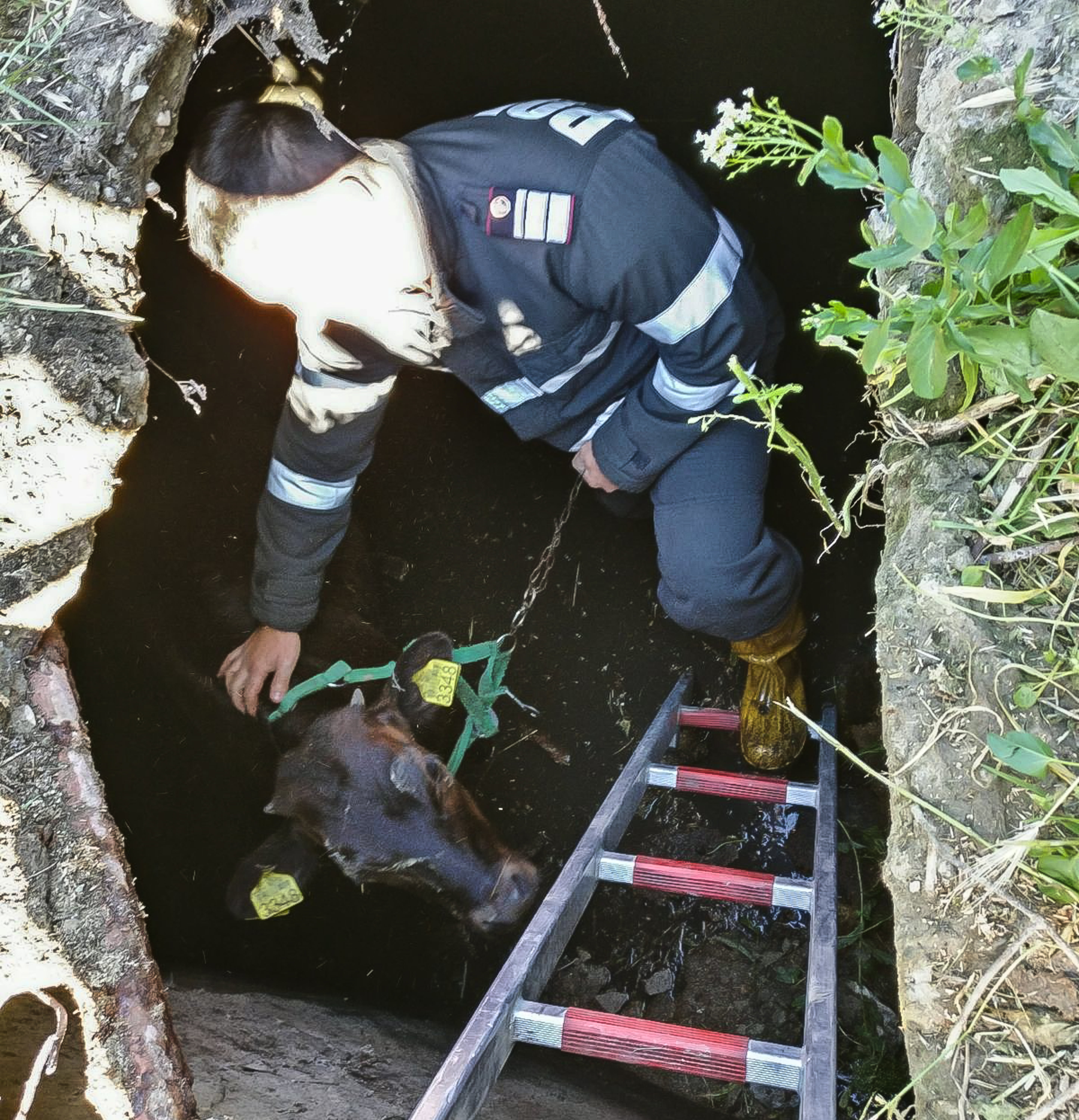 Viţel salvat de pompieri… dintr-o hazna (FOTO)