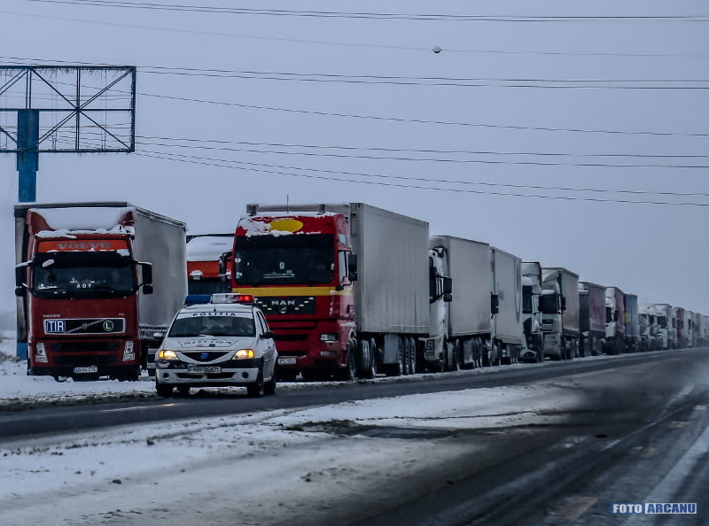 Circulație rutieră în condiții de iarnă, tiruri blocate în zăpadă şi restricţii la Vama Giurgiu