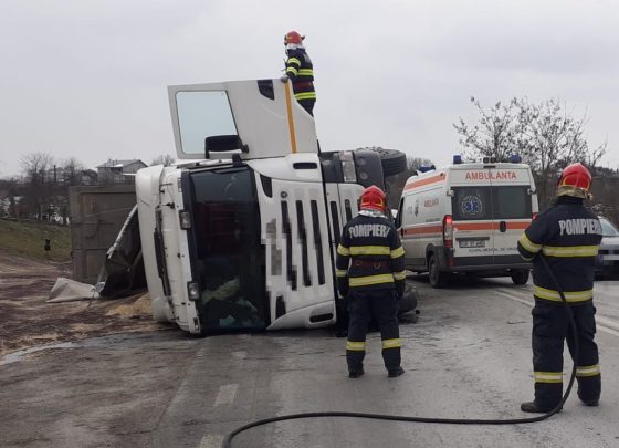 În urmă cu puţin timp, autotren încărcat cu rapiță, răsturnat pe DN 6, la intrare în localitatea Valea Plopilor (FOTO)