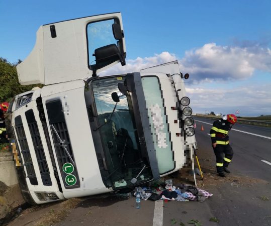TIR răsturnat pe DN 5, în zona localităţii Daia, în această dimineaţă (FOTO)