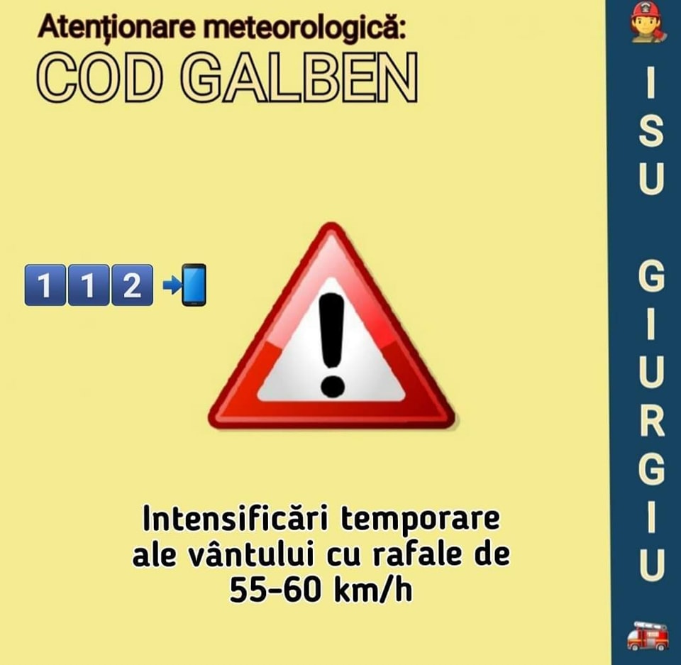 ISU Giurgiu. Atenţionare meteorologică tip COD GALBEN de vânt!