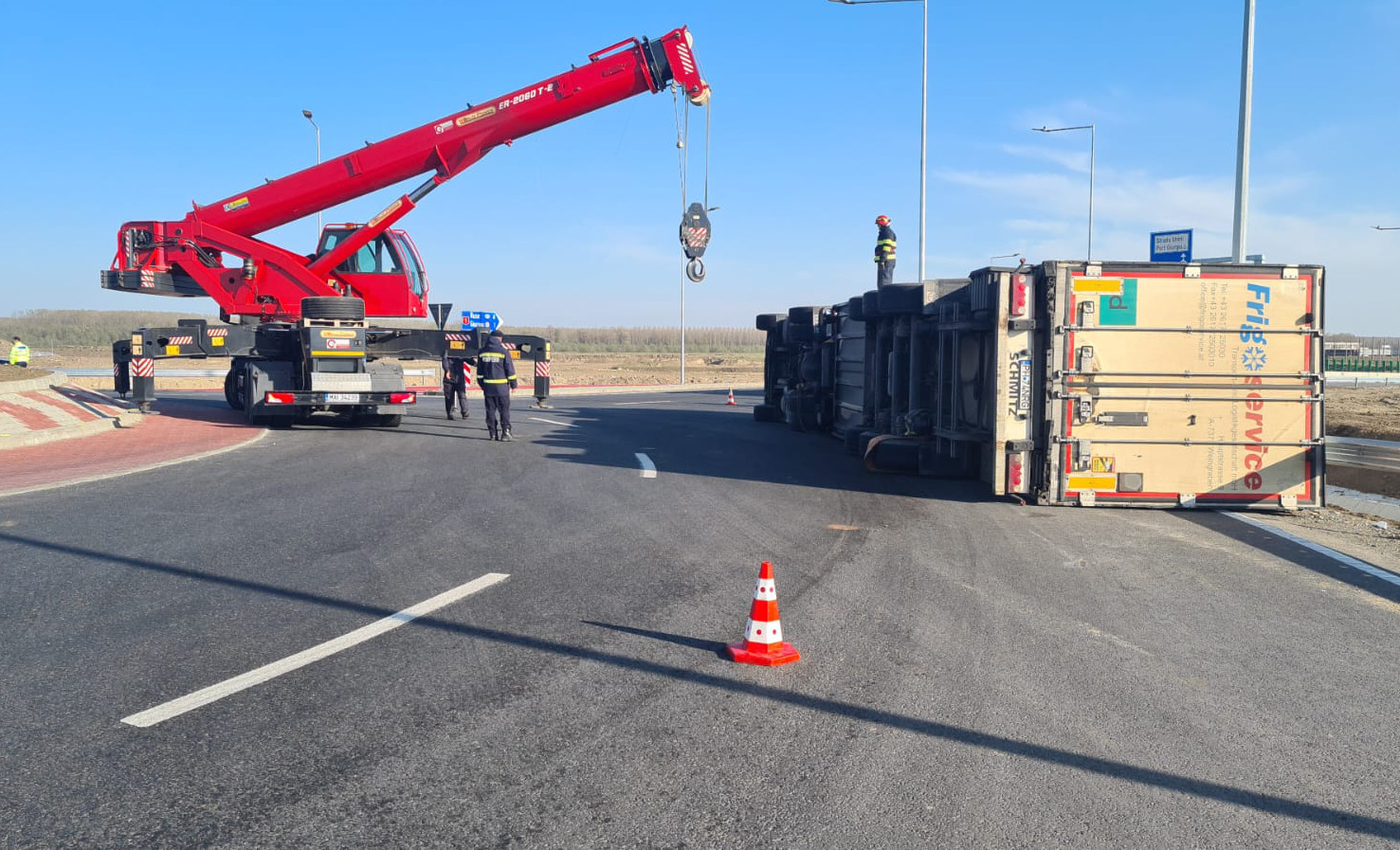 ACUM. TIR răsturnat în sensul giratoriu din intersecţia DN5 D cu DJ 507! (FOTO)
