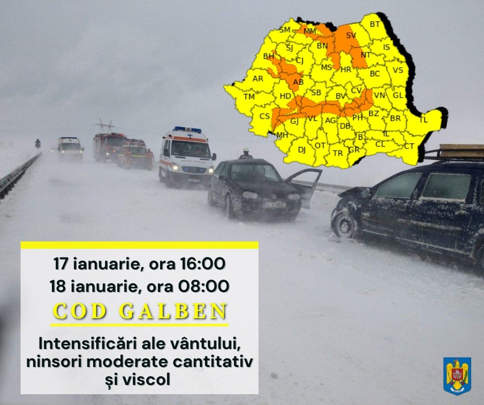 ISU Giurgiu. COD GALBEN de ninsori și vânt puternic, până mâine dimineață