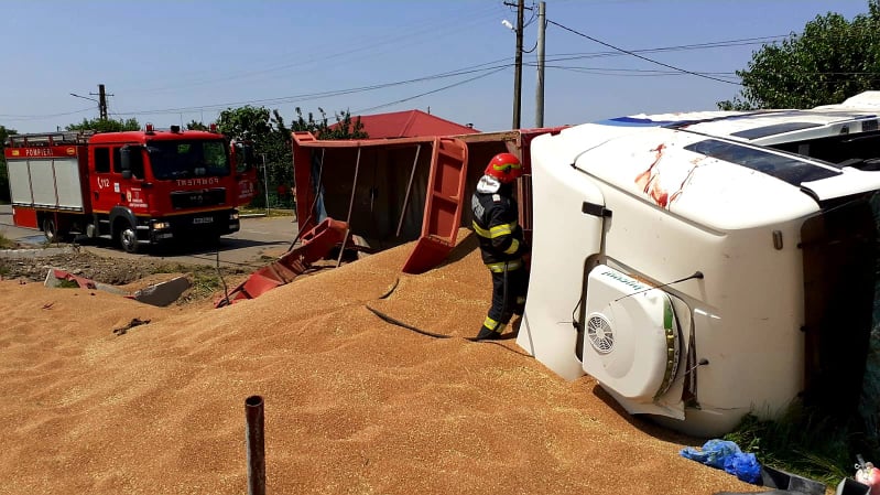 ACCIDENT RUTIER! Un autocamion încărcat cu cereale s-a răsturnat! Conducătoarea auto şi pasagerul, transportaţi la Spital! (FOTO)