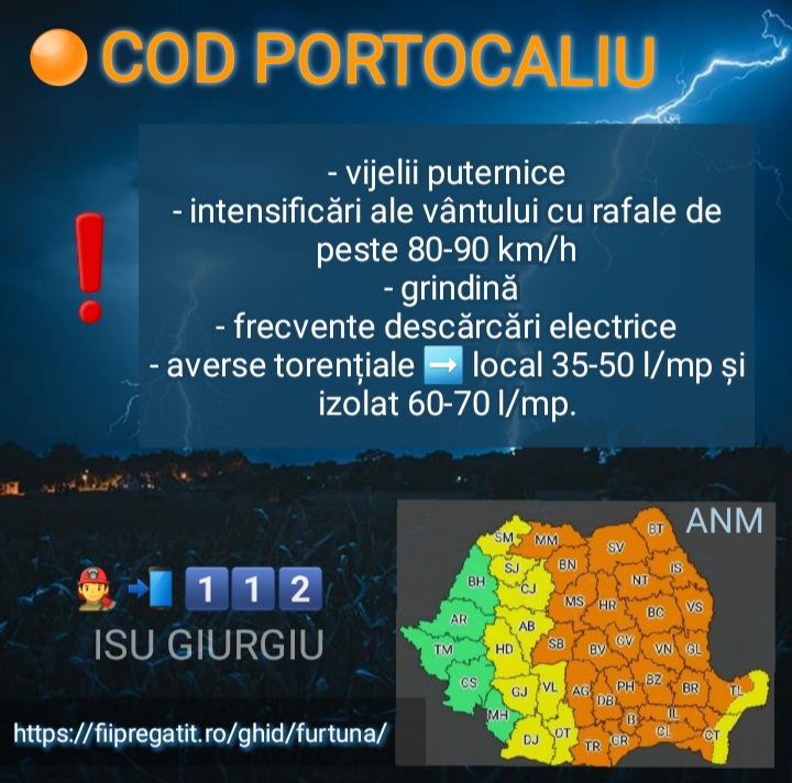 Avertizare ISU. COD PORTOCALIU de vijelii, ploi abundente și grindină, în județul Giurgiu
