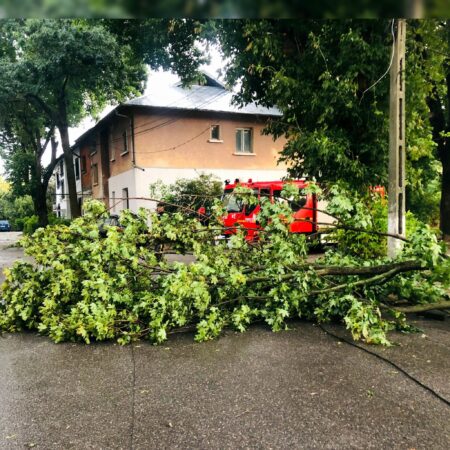 În urma fenomenelor meteo periculoase care s-au înregistrat ieri după-amiază, pompierii au fost solicitați să intervină pentru înlăturarea unor copaci, căzuți pe partea carosabilă, pe autoturisme sau cabluri de electricitate.