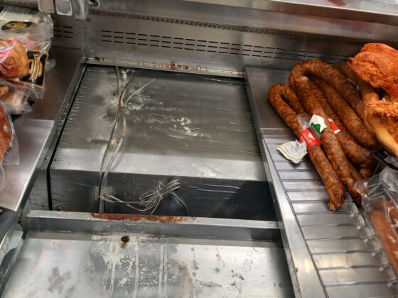 – conditii igenico sanitare precare în depozitul supermarketului: paviment neigenizat, prezența unor pânze de păienjeni pe tavan și var exfoliat pe perete