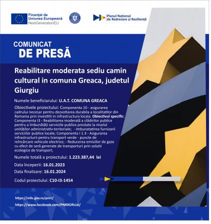– Componenta “Reabilitare moderata sediu camin cultural in comuna Greaca, judetul Giurgiu” – PNRR – Componenta 10 – Fondul Local – Investitia I3 – Reabilitarea moderată a clădirilor publice pentru a îmbunătăți serviciile publice prestate la nivelul unităților administrativ-teritoriale in cadrul caruia Comuna Greaca are calitatea de Beneficiar, titlu apel: PNRR/2022/C10/I3, Runda 1 si
