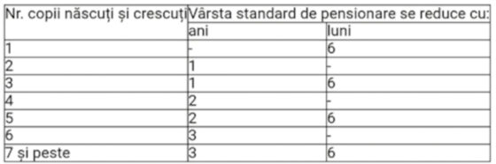 Conform art. 51 alin.(1) din Legea 360/2023 privind sistemul public de pensii, femeile care au realizat stagiul complet de cotizare contributiv şi care au născut şi crescut copii până la vârsta de 16 ani beneficiază de reducerea vârstei standard de pensionare prevăzută în anexa nr. 5, astfel: