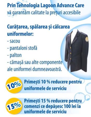 Oferta este valabilă în cazul ţinutelor de serviciu: curățarea, spălarea și călcarea următoarelor: sacou, pantaloni stofă, palton, cămașă sau alte componente ale uniformei dumneavoastră.