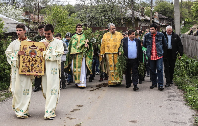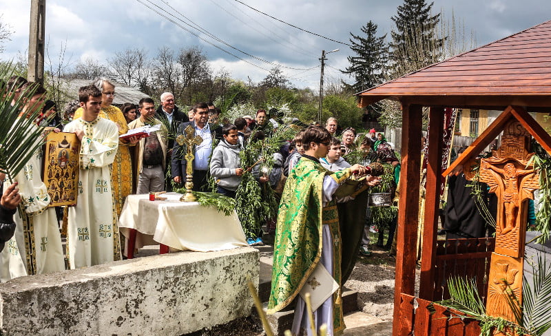 După săvârșirea slujbei Sfintei Liturghii, cei doi preoți, împreună cu primarul şi credincioşii, au pornit în procesiune purtând în mâini icoane, flori şi ramuri verzi de salcie.