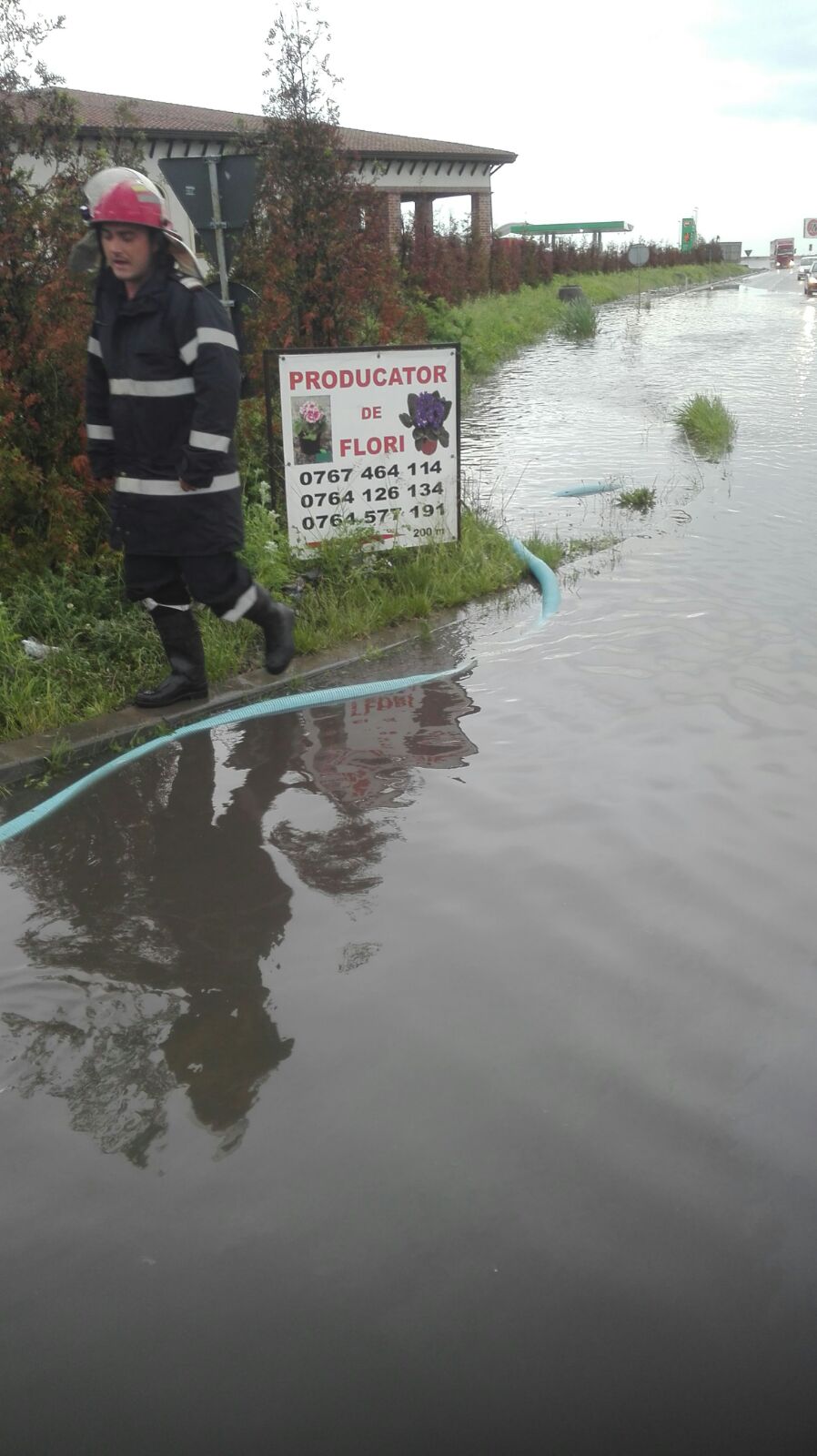 Poliţiştii au cerut sprijinul pompierilor pentru evacuarea apei de pe carosabil, iar traficul nu a fost blocat, dar s-a circulat cu viteză redusă. Un echipaj de la Punctul de lucru Călugareni a acţionat pentru evacuarea apei de partea carosabil cu o motopompă transportabilă. Subaru.