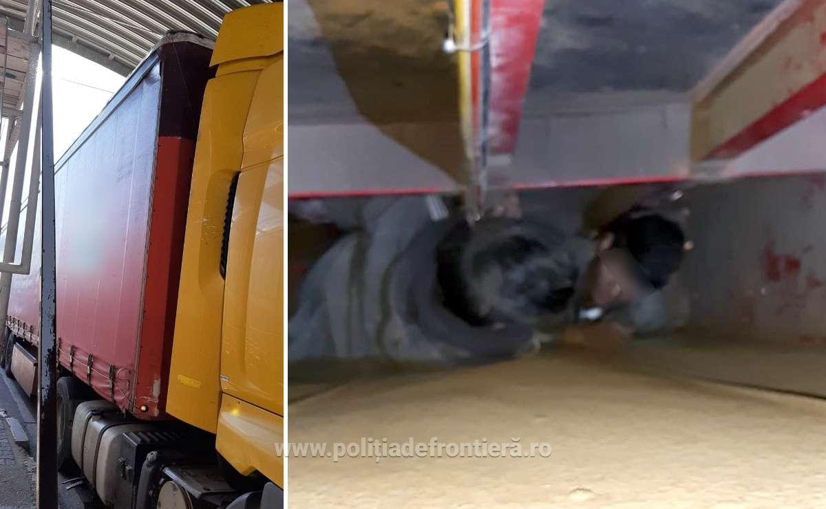 Procedând la verificarea mijlocului de transport, polițiștii de frontieră au descoperit ascunse, între podeaua semiremorcii și spațiul destinat roții de rezervă, două persoane de sex masculin, fără documente de identitate asupra lor.
