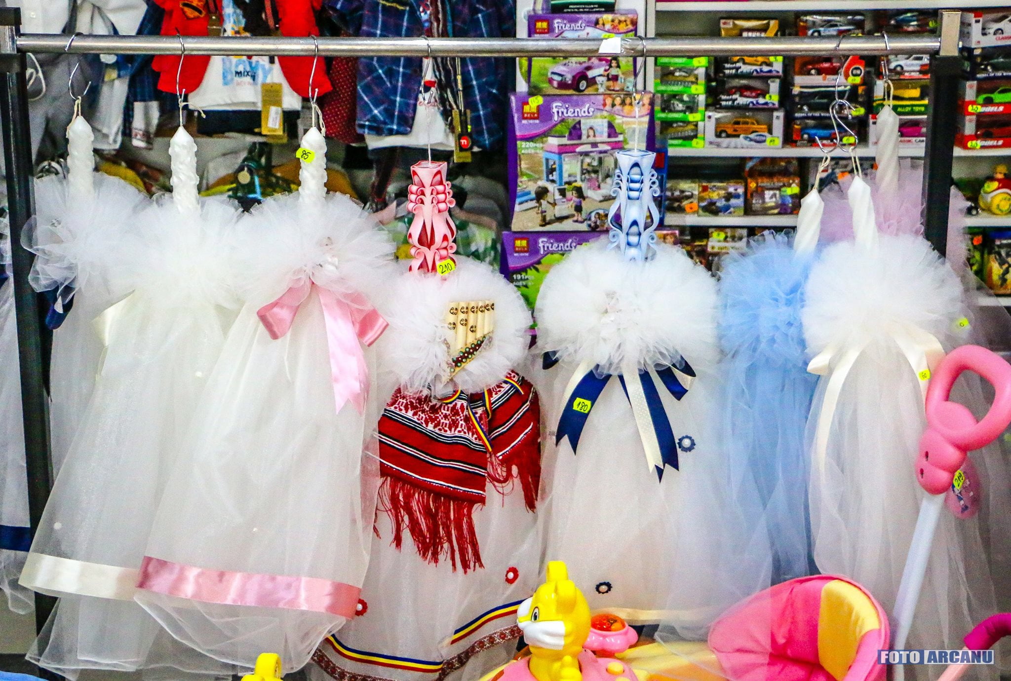 Lumânările de botez, de diverse dimensiuni, foarte frumos lucrate,  integrate în trusouri complete, vesele, sunt potrivite atât pentru fetiţe cât şi pentru băieţei.