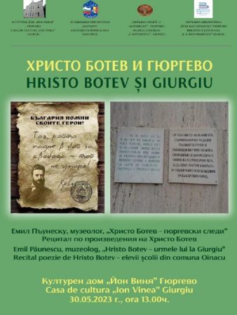 Astăzi, 30 mai 2023, cu începere de la ora 13:00, la Centrul Cultural „Ion Vinea”, din Giurgiu, va avea loc un eveniment dedicat poetului și revoluționarului bulgar Hristo Botev.