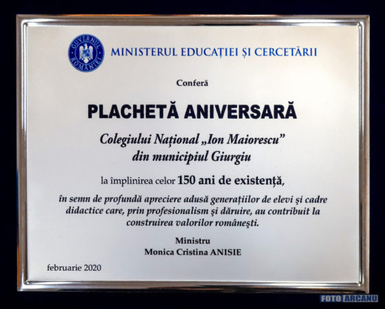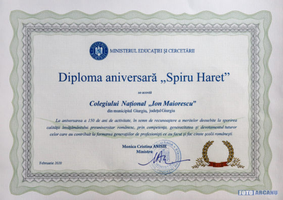 Colegiul Naţional „Ion Maiorescu”, din Giurgiu, a primit, astăzi, 28 februarie 2020, Diploma Aniversară „Spiru Haret” şi Placheta Aniversară din partea ministrului Educaţiei şi Cercetării, Monica Cristina Anisie.