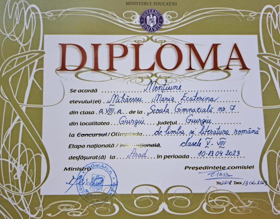 Felicitări! Eleva Maria-Ecaterina Mihăescu, de la Școala Gimnazială Nr. 7 Giurgiu, Menţiune la Olimpiada Națională de Limba și Literatura Română!