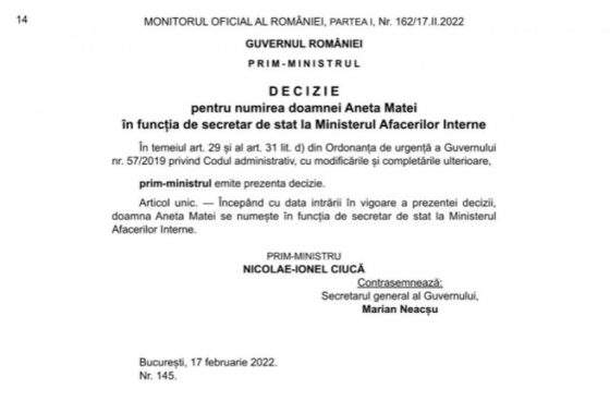 Astăzi, 17 februarie 2022, fostul prefect al judeţului Giurgiu, Aneta Matei, a fost numită în funcţia de secretar de stat la Ministerul Afacerilor Interne, principala atribuţie fiind coordonarea prefecţilor.