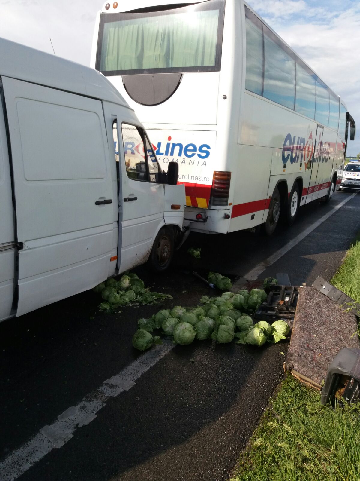 Şoferul dubei nu a păstrat distanţa regulamentară în mers faţă de autocar, intrând în coliziune cu acesta.