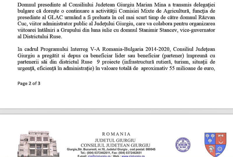 În acest sens, afirmaţia noastră se bazează pe comunicatul Consiliului Judeţean Giurgiu, pe care îl reproducem „Domnul presedinte al Consiliului Judetean Giurgiu Marian Mina a transmis delegaţiei bulgare că doreşte o continuare a activităţii Comisiei Mixte de Agricultură, funcţia de presedinte al GLAC urmând a fi preluata în cel mai scurt timp de către domnul Răzvan Cuc, viitor administrator public al Judeţului Giurgiu, care va colabora pentru organizarea viitoarei întâlniri a Grupului din luna iulie cu domnul Stanimir Stancev, vice-guvernator al Districtului Ruse.”