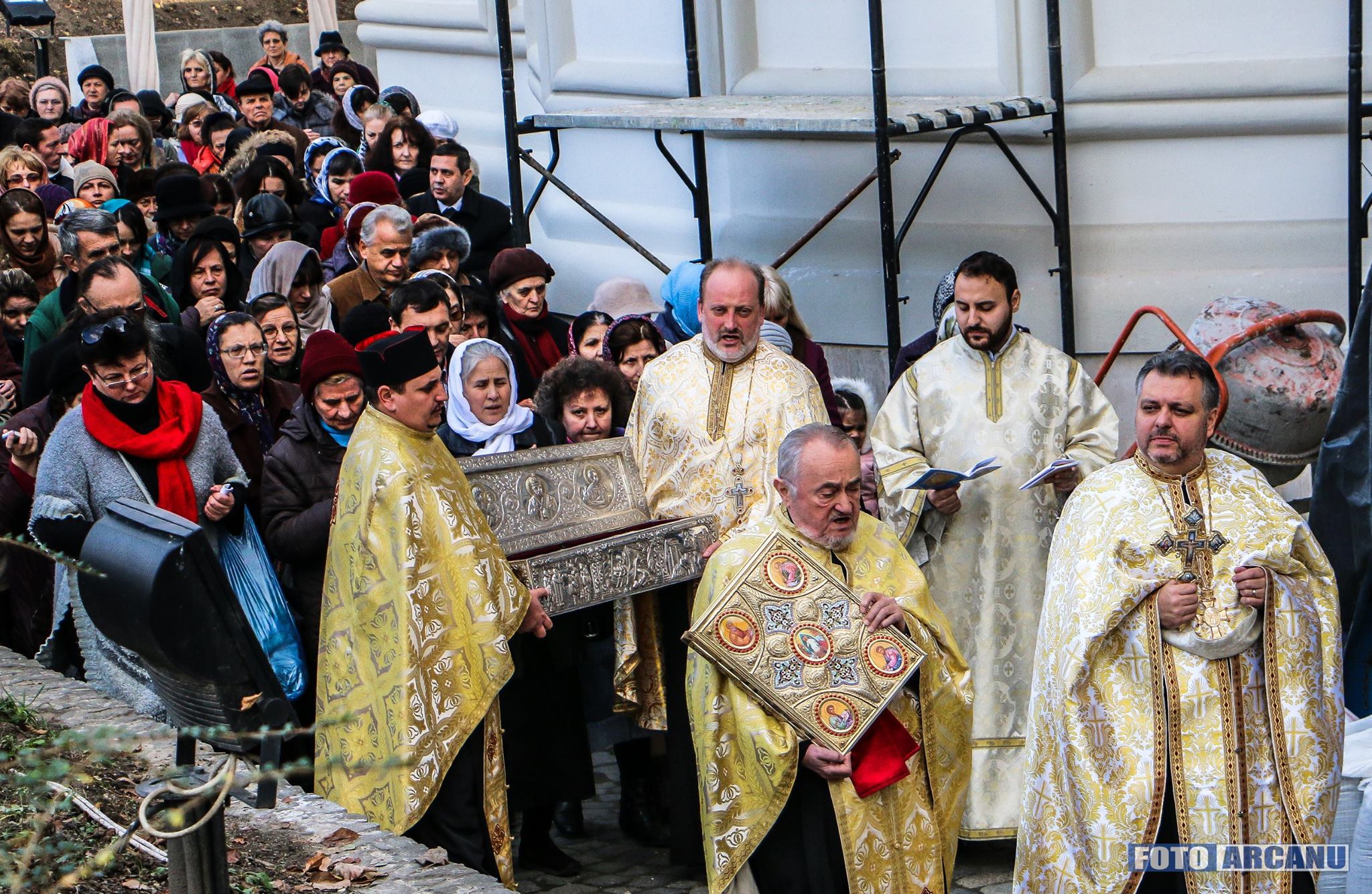 La ora 13:00, sfintele moaşte au fost aduse la Biserica Sfântul Gheorghe Nou, apoi, după o procesiune împrejurul bisericii, au fost aşezate în pridvorul bisericii voievodale.