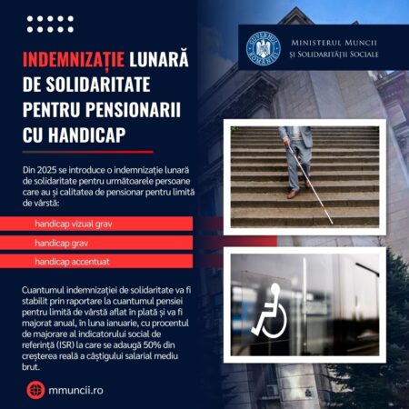 Guvernul României a aprobat, prin ordonanță de urgență, modificarea și completarea Legii nr. 448/2006 privind protecția și promovarea drepturilor persoanelor cu handicap, prin care se introduce, începând cu data de 1 ianuarie 2025, o indemnizație lunară de solidaritate pentru persoanele cu handicap vizual grav, handicap grav și handicap accentuat care au și calitatea de pensionar pentru limită de vârstă.