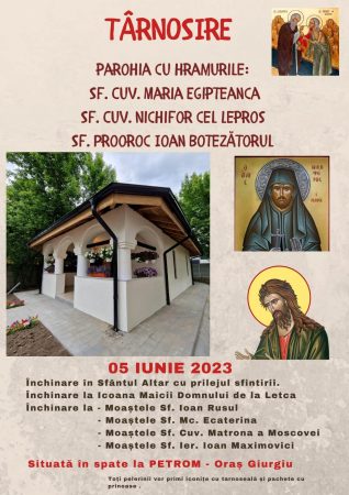 Luni, 5 iunie, giurgiuvenii sunt invitaţi la sfinţirea noii Biserici din Giurgiu, aflată în spatele Petrom, de pe şoseaua Bucureşti, cu hramurile: SF. CUV. MARIA EGIPTEANCA, SF: CUV. NICHIFOR CEL LEPROS şi SF. PROOROC IOAN BOTEZĂTORUL.