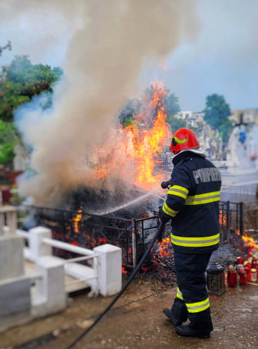 Aceștia au constatat că ardeau violent coroanele așezate pe un mormânt și au acționat rapid astfel încât flăcările să nu se extindă.