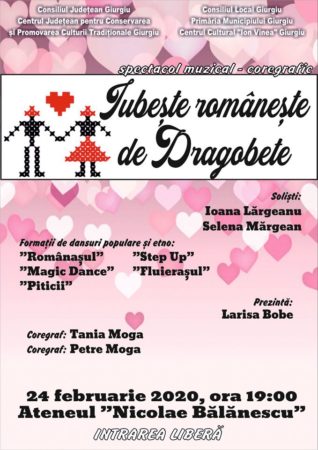 Sub genericul „Iubește românește de Dragobete”, Consiliul Judetean împreună cu Consiliul Local şi Primăria municipiului Giurgiu organizează, pe data de 24 februarie, un spectacol dedicat unuia dintre cele mai frumoase obiceiuri ale poporului român.