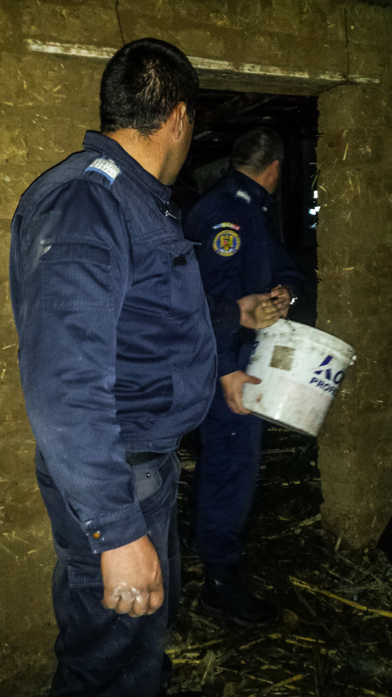 La locul intervenției au venit jandarmii din localitate, care au încercat să stingă focul cu stingătoare şi găleţi cu apă.